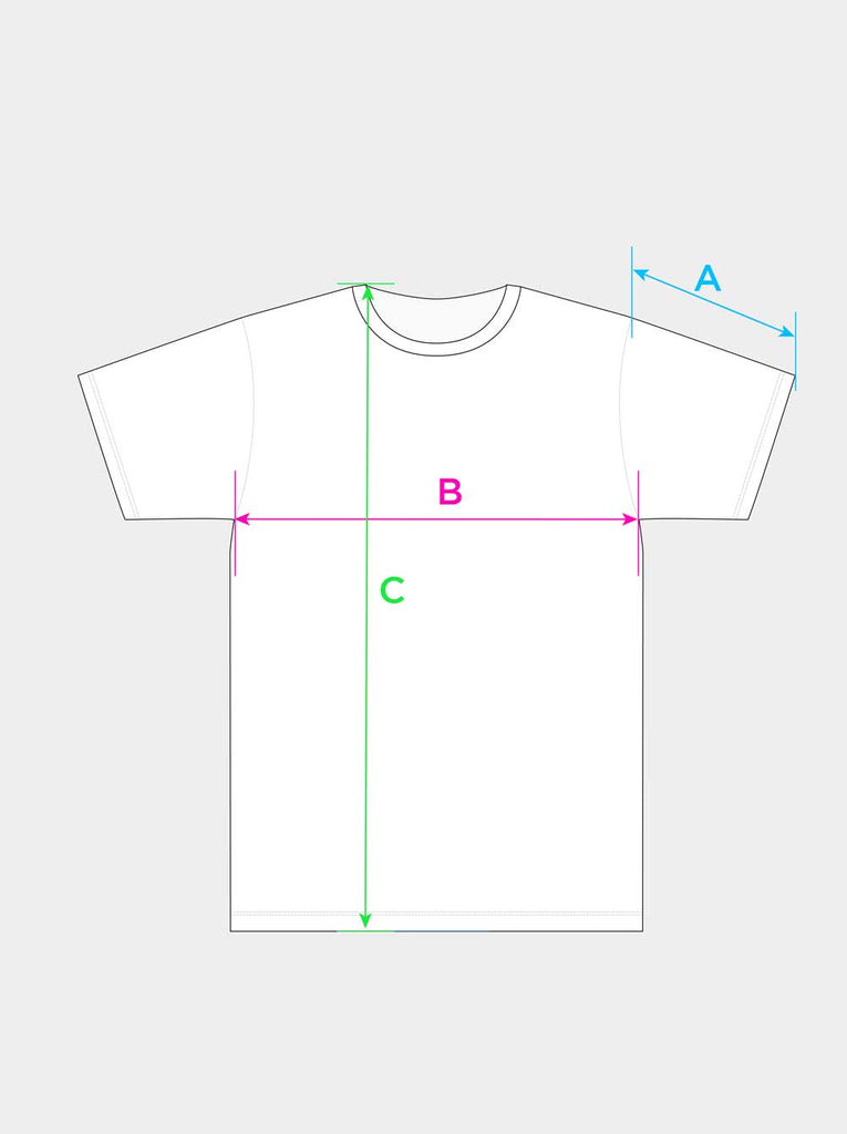 | T-shirts tailles unisexes | Longueur du bras (A) | Largeur de poitrine (B) | Longueur (C) |